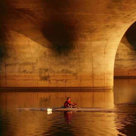 From afar the Extended Waalbridge already offers an intriguing sight but walking along the banks of the Spiegelwaal the beauty of its flowing lines and the reflection of the light in the water against the receding volumes is outright stunning. It is as if the flowing river itself sculpted the columns. And notice a detail in the concrete, right where column and deck meet. As if the column is an arm that applies force and therefor shows a dimple. Concrete can take subtle shapes as well.
